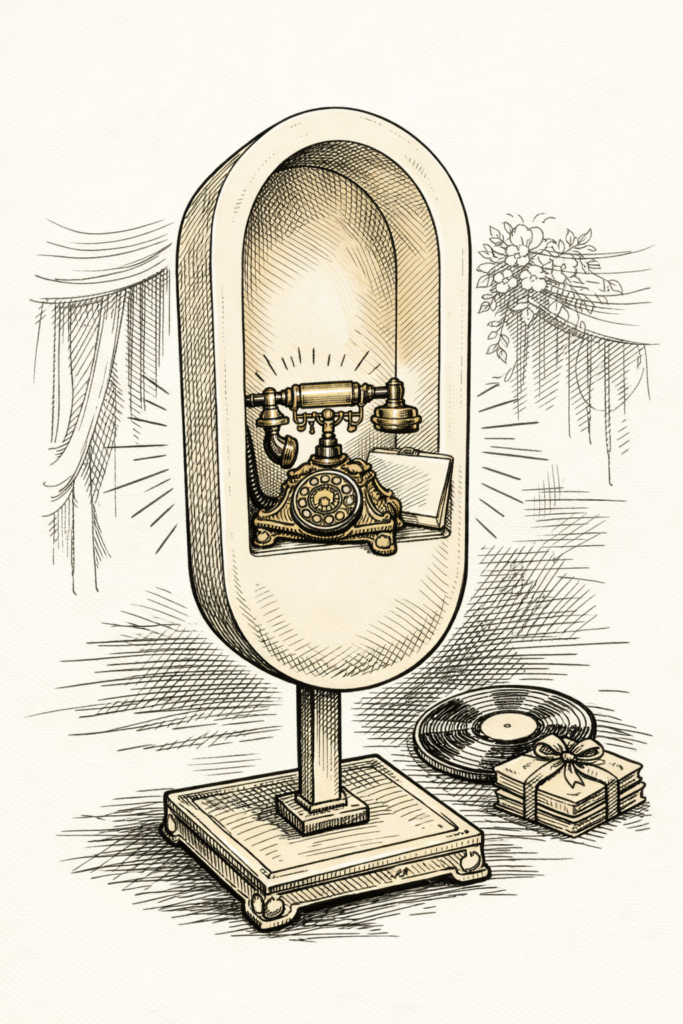 La véritable émotion mise en scène, profitez de notre téléphone accompagné de son présentoir artisanal réalisé sur-mesure transformant le livre d’or audio en un véritable objet décoratif qui saura sublimez vos évènements.